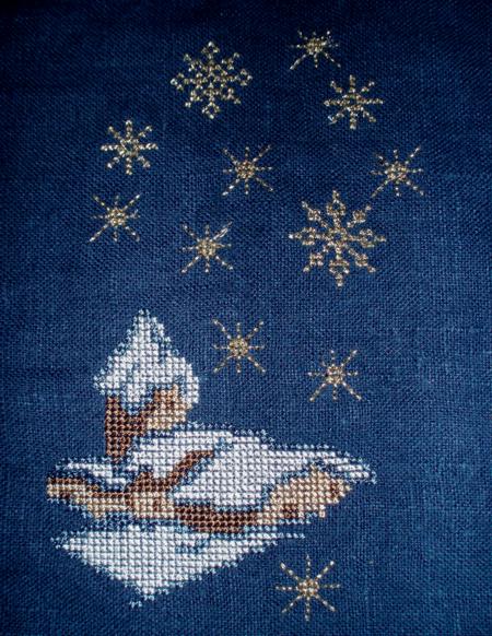 This contestant sent in pictures of her curtains. She writes: "It's a couple of short Christmas linen curtains for my kitchen windows to light up dark winter nights. They are embroidered with crosstitch motifs of houses and pinetrees with snow on. I am using a Husqvarna Designer 1 USB machine for my works."