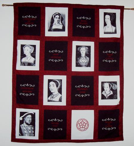 "My entry is a Tudor wall hanging that uses your designs for Henry VIII and his wives. It was a prize I made for a raffle drawing in a medieval re-enactment group I belong to, the Society for Creative Anachronism. The winner of the wall hanging uses it as decoration inside of her medieval pavilion (tent). It is stunning! I used my Baby Lock Ellegeo machine to create this wall hanging. I embroidered the names in script and added a scroll design. I wish I had ordered the name scrolls that were available from Advanced Embroidery Designs as they would've showed up better."