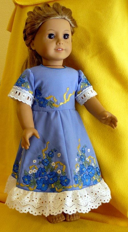 You can read about how to embroider and assemble the dress on the page with instructions.