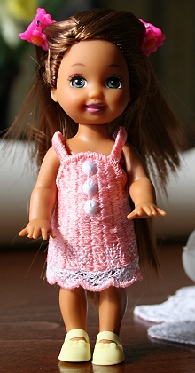 Rinse the stabilizer thoroughly in warm water. Unlike doilies, the doll clothes should be soft and have no stiffness in them. Attach a small bead or a button to the back.