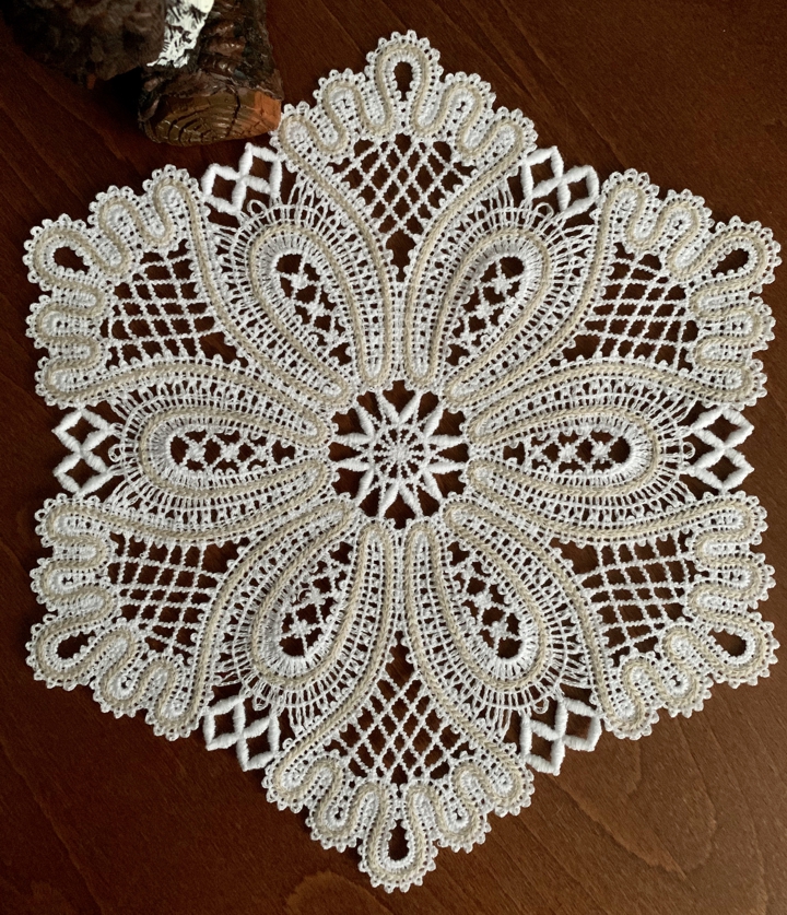This machine embroidery design is part of our Christmas Freestanding Lace and Freestanding Battenberg Lace Doily collections. It uses the Freestanding Battenberg Lace technique. It will fit the Commercial hoop (8" x 12").