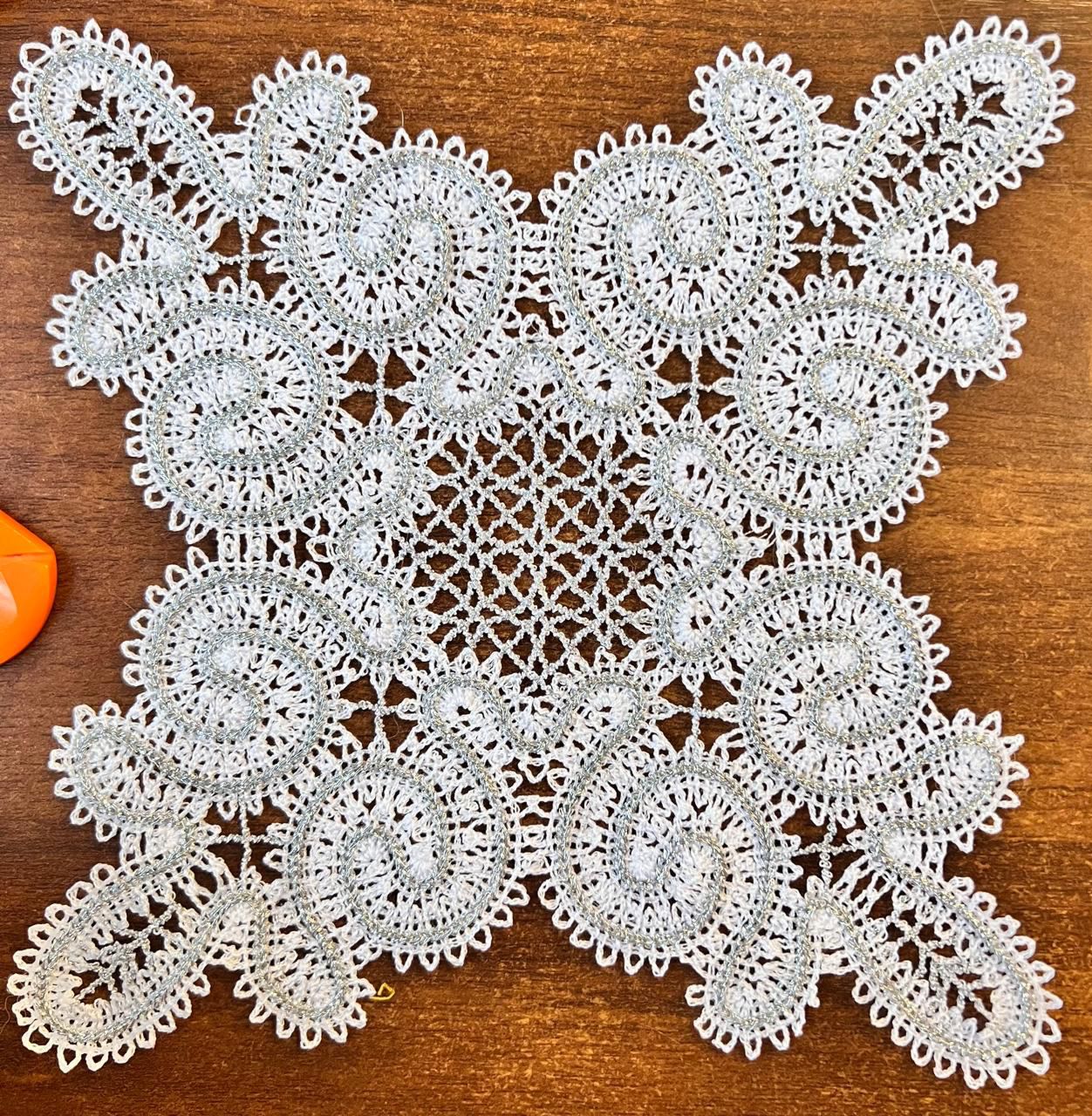 This machine embroidery design is part of our Freestanding Battenberg Lace Doily collection. It uses the Freestanding Battenberg Lace technique. It will fit the Commercial hoop (8" x 12").