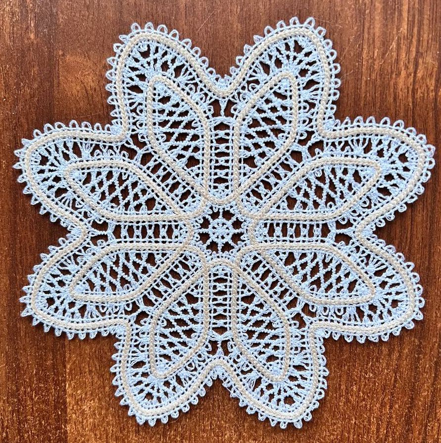 This machine embroidery design is part of our Freestanding Battenberg Lace Doily collection. It uses the Freestanding Battenberg Lace technique. It will fit the Commercial hoop (8" x 12").