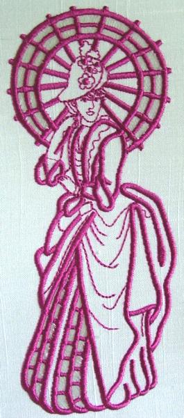 This machine embroidery design is part of our Cutwork Lace Ladies collection. It uses the Lace technique. It will fit the Large hoop (5" x 7").