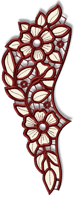 This machine embroidery design is part of our Cutwork Lace Borders collection. It uses the Cutwork Lace technique. It is available for the Large hoop (5" x 7") and Mega hoop (6" x 10").