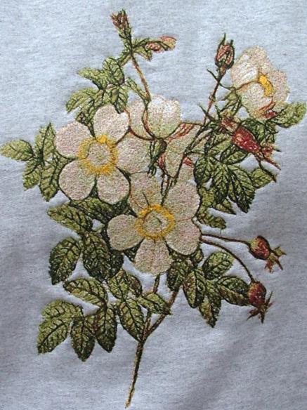 We embellished a sweat-shirt with this rose. For embroidering on knits we use No Show nylon mesh by Floriani and water soluble mesh.