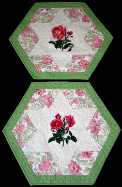 We made Table Toppers with the designs. You can read about the project on the page Hexagonal Quilted Table Toppers with Rose Embroidery.