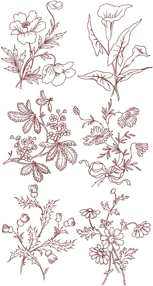 This set of machine embroidery designs is part of our Redwork Flowers collection. It uses the Redwork technique. The designs is available for the Large hoop (5" x 7") and Mega hoop (6" x 10").