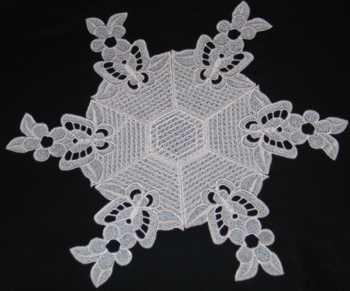 To make the doily, you'll have to embroider 6 doily panels and the doily center. The doily panel is in the upper left corner of the picture. The doily's center is the small hexagon in the bottom row.