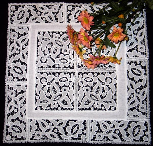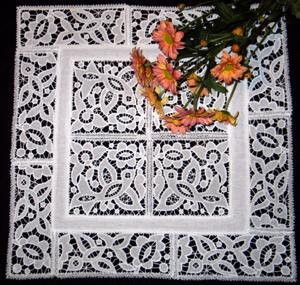 You can use the two motifs to make lace inserts or borders on tablelinens. To make this doily, we connected 4 square motifs. Stitched them on a piece of fabric, then removed the fabric from under the lace to make an insert. After this we attached 8 rectangular motifs to the fabric. Then removed the excess fabric from under the lace getting the lace border.