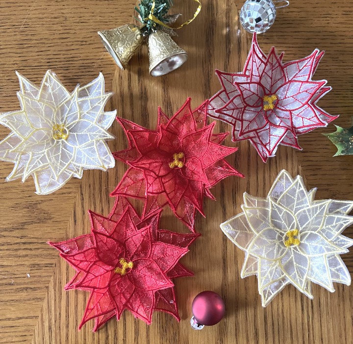 We used poinsettia stitch-outs in making this Christmas Table Top Decoration. You can read about it on the project page.