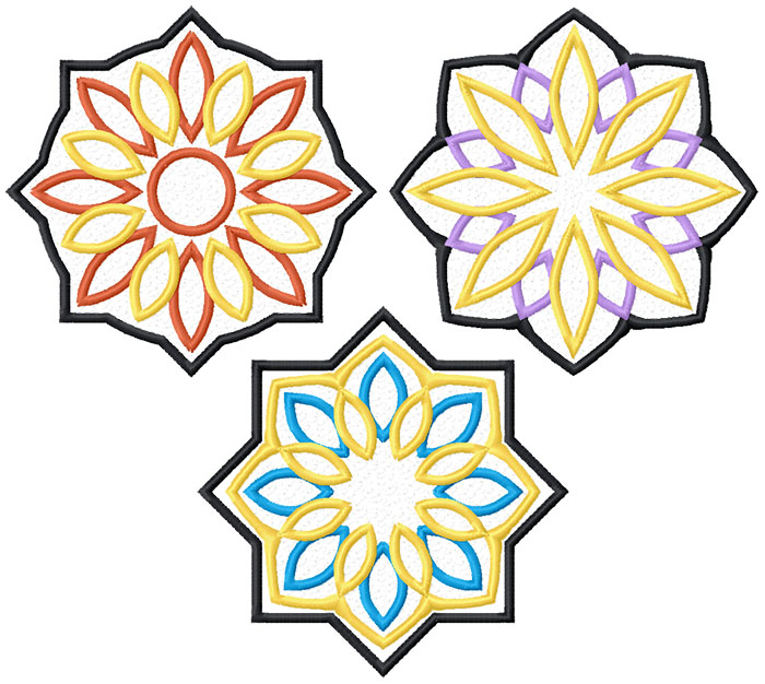 This set of machine embroidery designs is part of our Embellishments collection. It uses the Satin Stitch technique. The designs will fit the Large hoop (5" x 7").