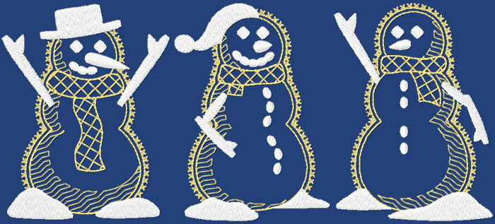 This set of machine embroidery designs is part of our Christmas Snowmen collection. It uses the Satin Stitch technique. The designs will fit the Small hoop (4" x 4").