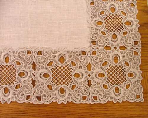 Measure the inner opening of the rectangle. It should be about 28 1/2" x 5". Take a piece of fabric measuring 1/2" more than the opening. We used a 29" x 5 1/2" piece of linen. Finish the raw edges of the fabric with zigzag. Place the embroidered lace over the fabric, aligning the edges. Pin the lace to the edges of the fabric and zigzag in place. Use the same thread as you used for embroidery.