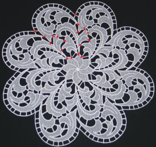 Step Two: Press all parts with steam. On your working table, lay out the designs as shown on the picture below. Thread a needle with the same thread that you used for the embroidery and stitch together the parts in the places marked with red.You will get a lace frame. This has to be done manually.