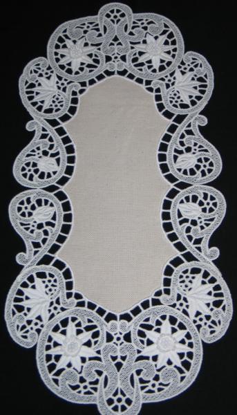 You will need Vilene water soluble stabilizer, embroidery threads, a 12" x 22" piece of linen fabric. The finished size of the table runner is about 9 1/2" x 20".