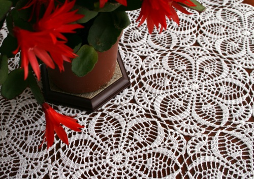 You will need water-soluble Vilene stabilizer and 50- or 60-weight cotton embroidery threads. The finished size of our table topper is about 25".