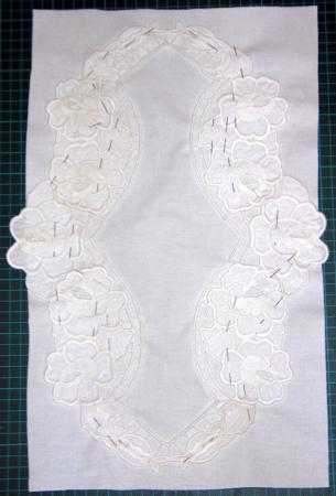 Step Two: Cover the outline with fabric and start the machine. You can secure the fabric by pinning it to the stabilizer outside the embroidery field, or using quilter's tape. The machine will embroider the outline of the lace and stop.