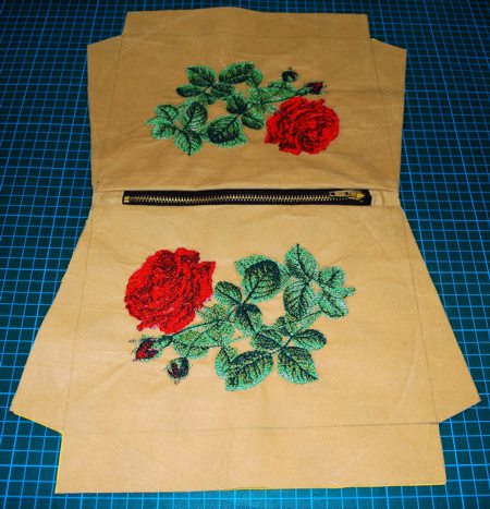 Out of suede, cut out 2 pieces about 10" x 12". Stabilize each piece with the medium-weight iron-on cut-away stabilizer. Make the embroidery of The Dark Lady Rose on both pieces.