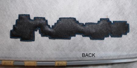 Step One: Hoop 2 layers of the water soluble mesh. Position a piece of applique fabric over the hoop. (We used thin pleather, a polyester fabric that looks like leather).