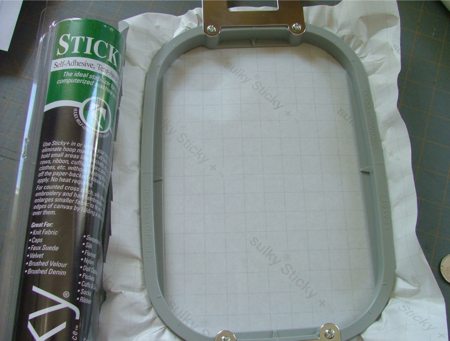 Remove the protective paper. Attach the leather strip to the adhesive so that the position you marked for the center of the design lies in the center of the hoop.