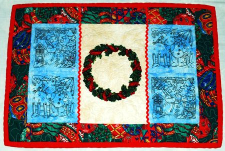These easy-to-make Christmas-themed placemats can definitely add a little holiday flair to your dining room. We used the designs from the Redwork Snowman Set for a large, 5" x 7", hoop and Christmas Wreath for a commercial , 7" x 7", hoop.