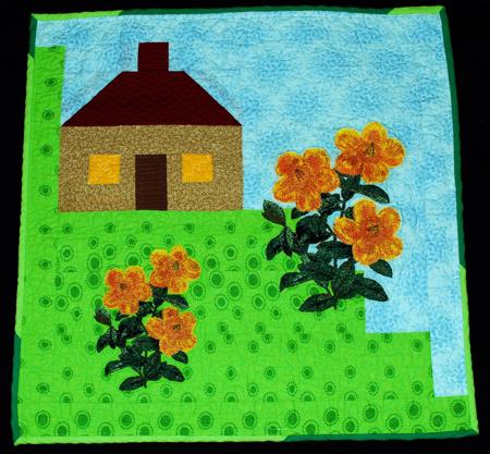 Out of sky blue fabric cut a square measuring 9" x 9" and sew it to the right edge of the house block.