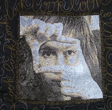 Pin both layers together with 1" pins. We quilted around the embroidery and all over the squares in a free-motion style. We wrote the name of the design "look" in gold and silver threads. Remove the pins while quilting.Note: We quilted without batting - the canvas is heavy enough for this.