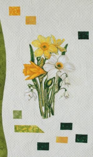 Although the Spring is still a little way away, we couldn't resist putting together this charming wall quilt with springtime colors. The quilt features the designs from the Spring Bouquet. The finished size of the wall hanging is about 26" x 21" .