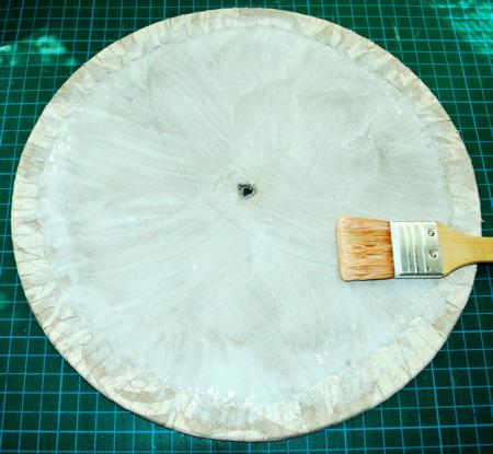When the glue dries, cut away the excess fabric around the circle leaving margins about 1" wide.