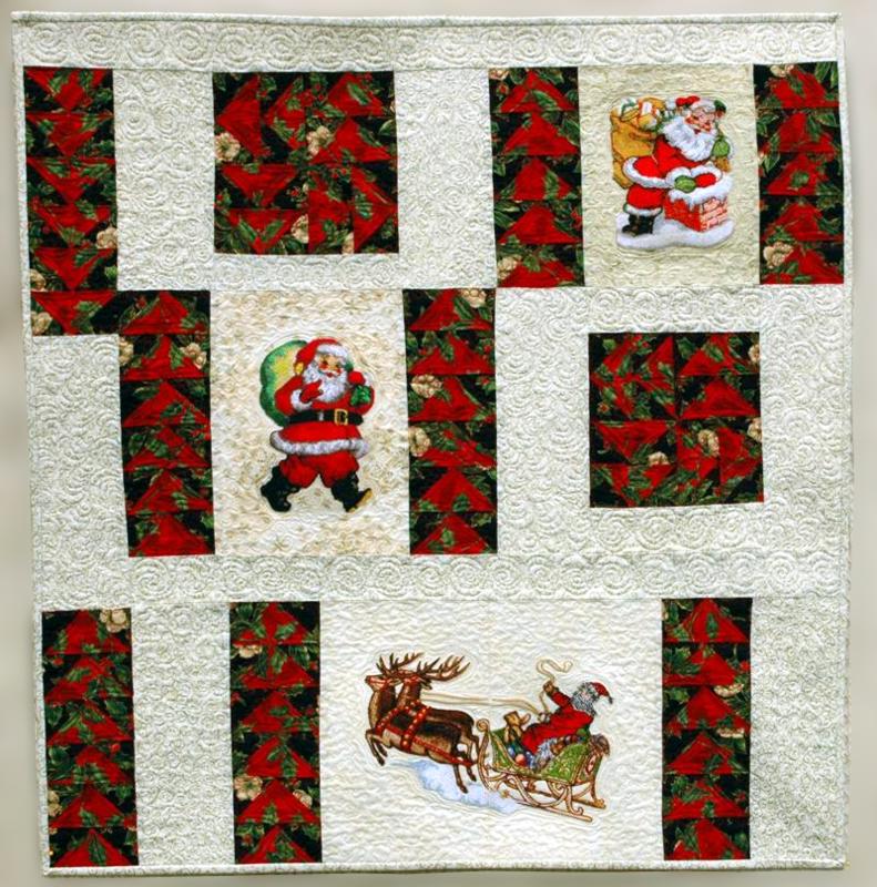 | For this wall quilt, we used the embroidery designs Santa Claus with Gifts, Old Saint Nick, Santa's Sleigh Set for the mega hoop. The finished size of the quilt is about 35" x 36". |