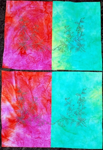 After the stitch-outs are done, trim the stitch-outs to 5 1/2" x 5 1/2" squares and sew the stitch-outs together in pairs, with seam allowance 1/4"