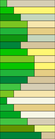 3rd, 7th, 13th and 17th strips: Cut a 6 1/2" long green strip and 10 1/2" long light-colored strip. Sew them together. Label the strips