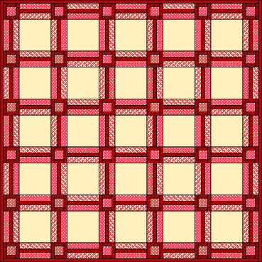 Take the light patterned 3 1/2" x 3 1/2" squares and dark patterned 1 1/2" x 3 1/2" and 1 1/2" x 5 1/2" strips, and sew them into 36 blocks: