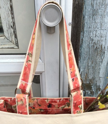 | Pin the D-ring parts to the back of the lining, 5 1/2" from the side seams. Stitch them in place. |