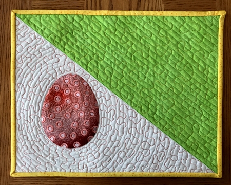 | Now upload the files from the Easter Egg Set into the machine and embroider them one by one all over the tablerunner. Use the light- to medium-weight cut-away stabilizer. Please note that the embroidery uses running stitches and is not dense. The background fabric will be visible through the embroidery. That's why you should be careful with the colors you use over the green fabric. We recommend to use either yellow or blue shades over green. |