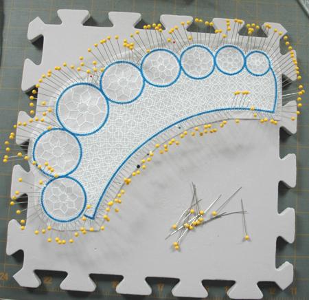 | Rinsing away the stabilizer is also an important step, because the lace can be stretched or distorted if this is done incorrectly. We recommend to use a foam board and stainless pins. Cut away the excess stabilizer close to the stitches. Take your time and carefully pin every single loop on the lace's outer edge to the board.