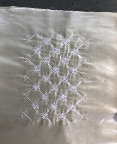 On the working table, place 2 layers of water-soluble mesh stabilizer; a layer of light-weight fabric, right side up; and a layer of organza. The organza is optional. Hoop tightly and embroider the design of your choice.