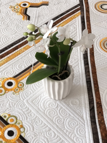 This quilted tablerunner features modern styling and embroidery designs from the Lines and Circles Border Set. The designs are for the large hoop (5" x 7").