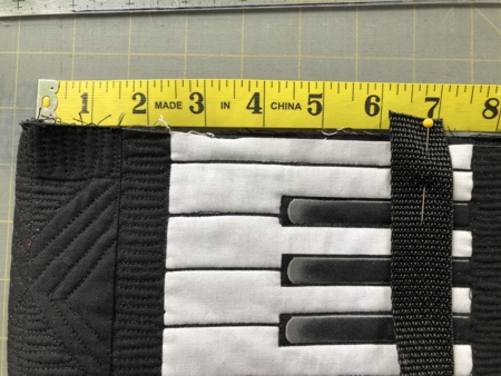 Out of black fabric, cut 2 strips measuring 2" x 20". Press the long edges of the strips 1/4" to the wrong side. Pin one of the strips over the seam, covering it.