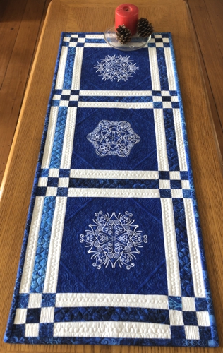 Designs from the Snowflake Set. The finished size of the tablerunner is about 14" x 36".