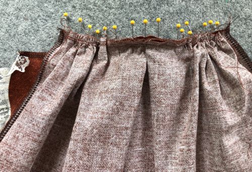 Cut a 8"-long piece of lace. Gather or make pleats. Pin along the upper edge of the stomacher between the inner running stitches, face side inwards.