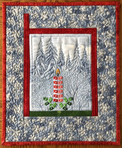 Press with heavy steam. Square the piece and trim it to 13" x 17". Finish the raw edges with the binding. |