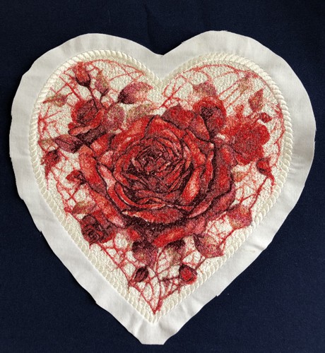 Open the color card, select threads. Stabilize a piece of white fabric with medium-weight cut-away stabilizer. Hoop the fabric tightly. Upload the Heart of Roses file into your machine and embroider it.