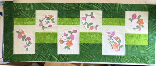 We used the designs from the Flowers and Vines Set. The finished size of the tablerunner is about 15" x 39 1/2". |