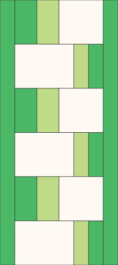 | Sew the 3 1/2" x 6 1/2" light and dark green strips in pairs along the long sides. You'll get 3 pairs. |