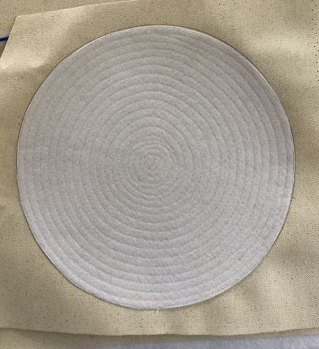 Trace the plate over the craft felt and cut out. Place the felt circle over the canvas circle. Pin. Topstitch the felt circle to the canvas in a spiral line. |