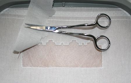 Take the hoop out, but DO NOT take the embroidery out of the hoop! With a pair of sharp scissors, cut out the fabric inside the outline.