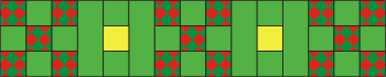 Out of the forest green fabric, cut: A strip 2 1/2" wide and as long as the width of the fabric. Subcut the strip into 16 squares measuring 2 1/2" x 2 1/2" and 2 strips measuring 2 1/2" x 6 1/2". Two strips 3 1/4" wide and 30 1/2" long. Two rectangles measuring 12" x 6".