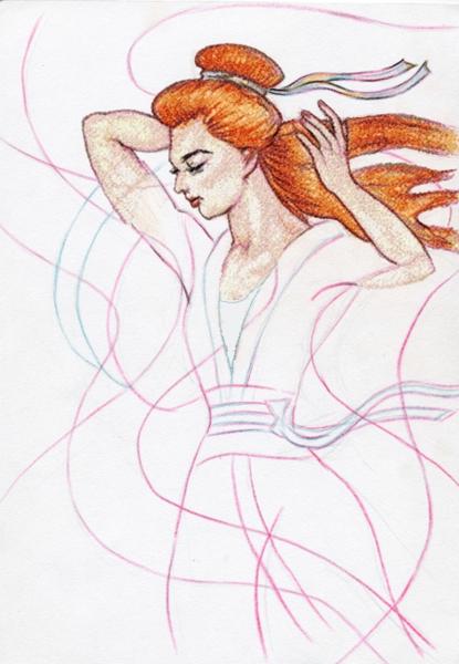 To add some sparkle to the Lady's red hair, we used red Angelina fibers.